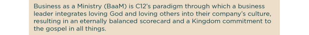 Stewardship begins with recognizing that your business is a platform for ministry. At C12, we believe ministry is not limited to what happens at church. It also includes leading our businesses for the glory of God and the advancement of the gospel. Embracing the call to BaaM frees you from fear and strengthens your leadership.